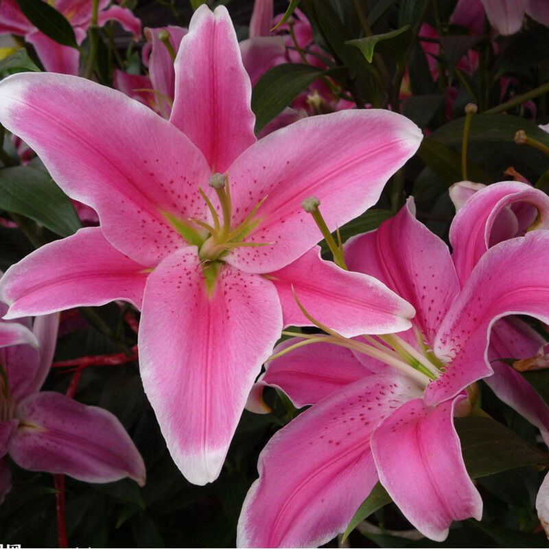 花 材:康乃馨五扎,香水百合两扎,天堂鸟半扎,红掌半扎,散尾葵适量,高层花架1只,粉红棉纸装饰。