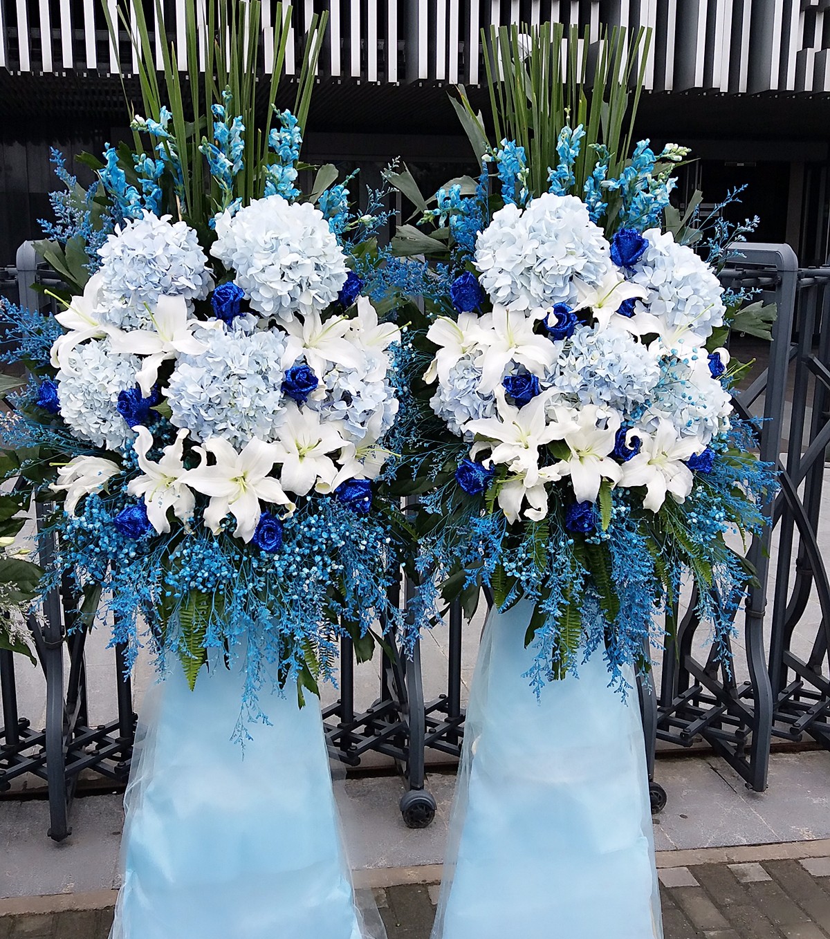 花 材:5只绣球,8朵蓝色妖姬,8朵百合,搭配情人草,满天星,剑叶,阔叶。