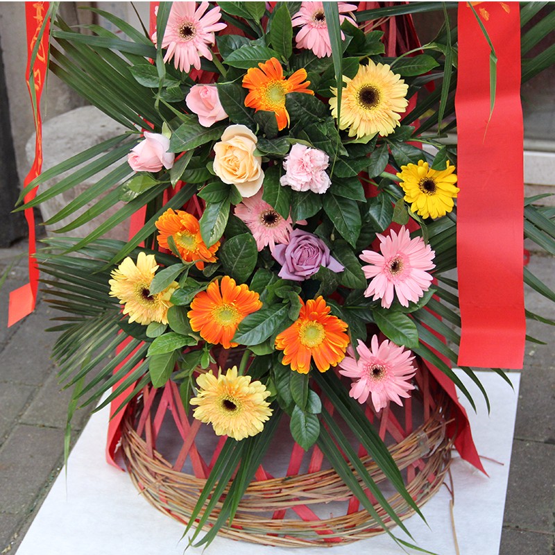 花语: 由于包扎花篮的花艺师不同,可能在花篮的形式和搭配上与图片不完全一致,但我们保证鲜花的主花材品种、新鲜程度、数量、颜色与说明一致。