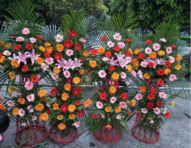 花材: 三色太阳花共50朵,2朵香水百合,散尾葵适量,高层花架一个。
