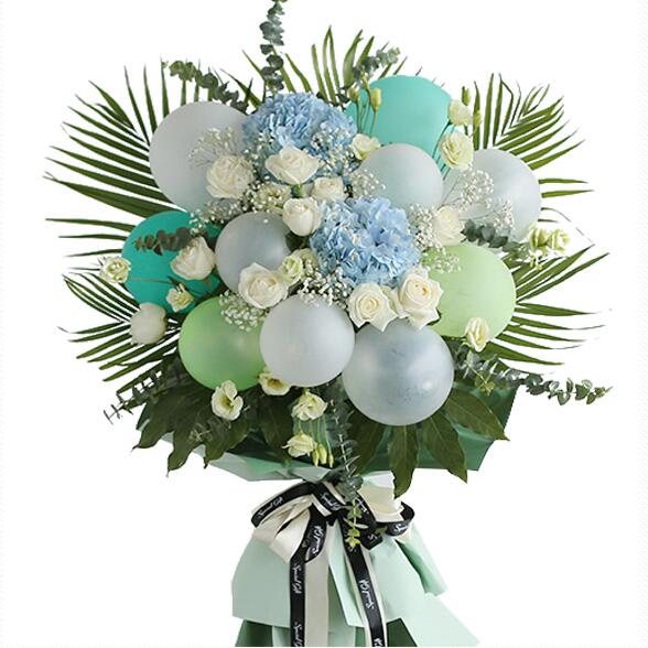 花 材:气球10个(白6浅绿2青色2),蓝绣球两朵,白玫瑰和白桔梗适量,尤加利、散尾葵、巴西叶搭配。