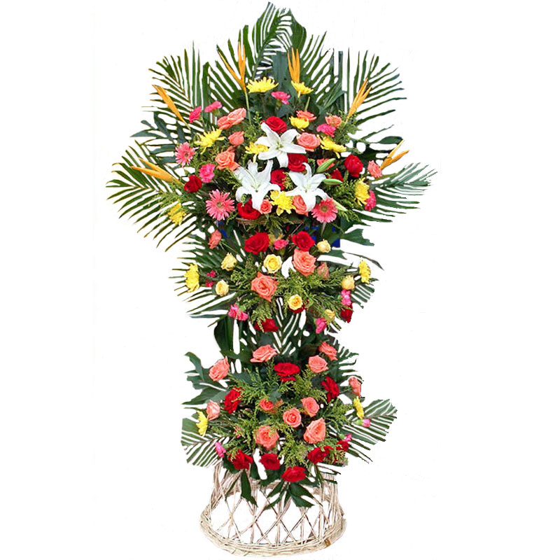 花材: 三色玫瑰两扎,各色弗朗花一扎,三朵香水百合,多头小玫瑰,散尾葵,绿叶装饰,三层花架。