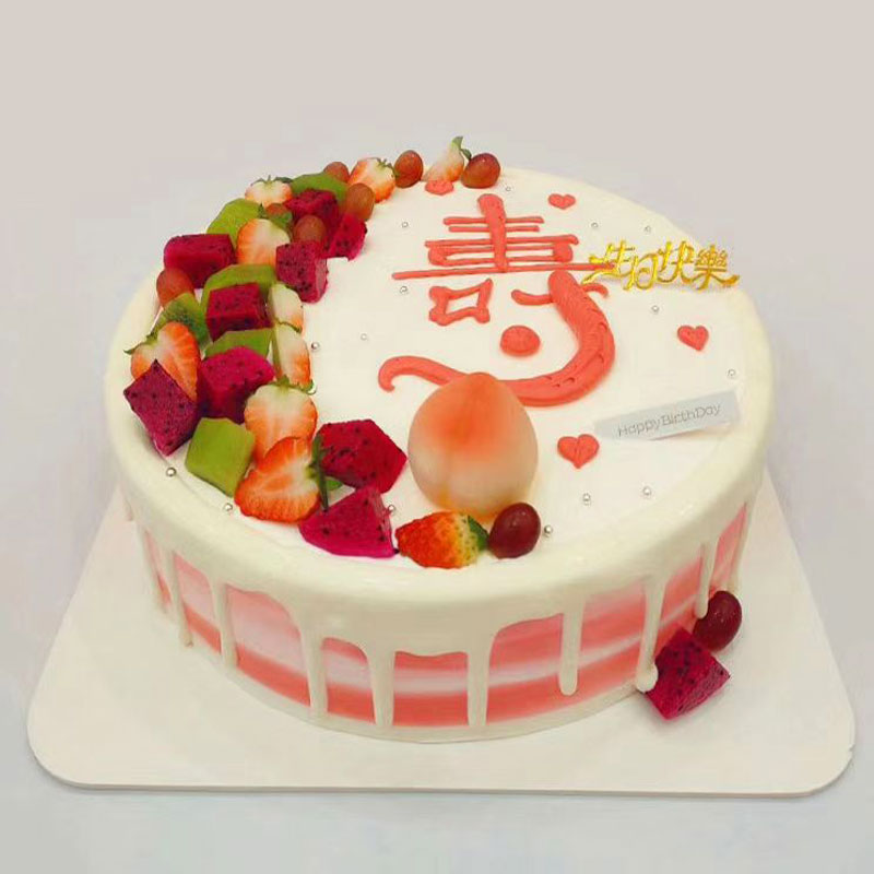 蛋糕材料: 圆形鲜奶水果蛋糕,时令水果装饰,粉果酱写有“寿”字。