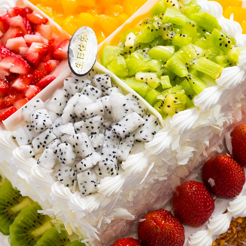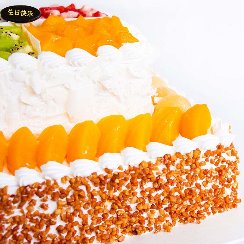 蛋糕材料: 双层奶油水果蛋糕,时令水果装饰,花生脆搭配
