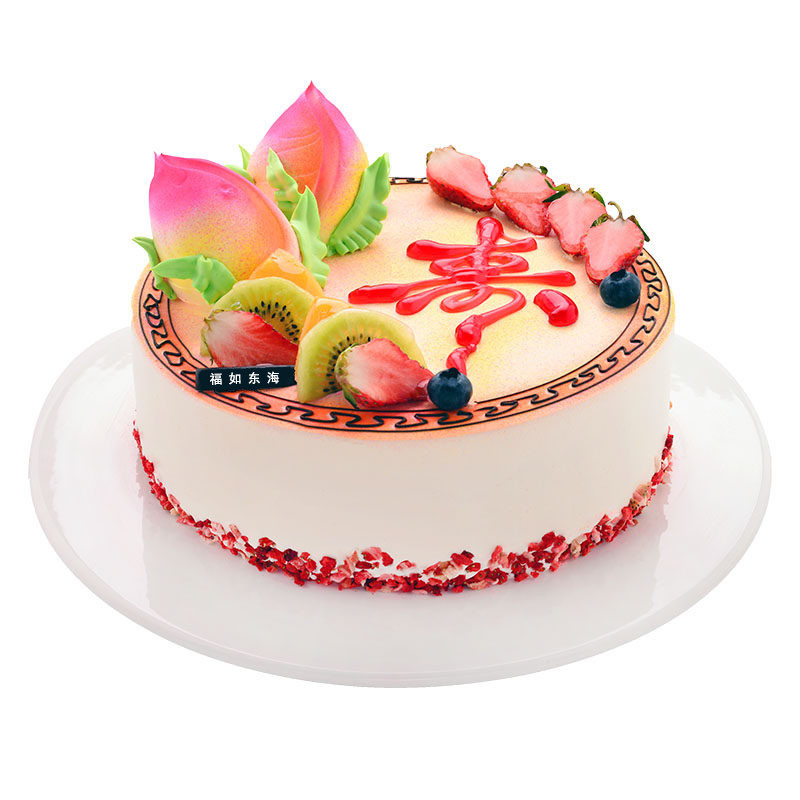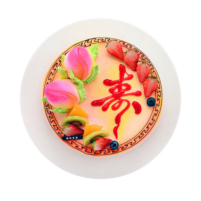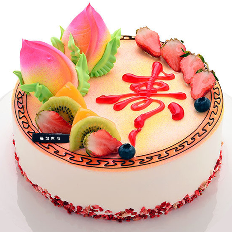 蛋糕材料: 鲜奶圆形蛋糕,时令水果、2个蟠桃装饰,红色果酱写有“寿”字。