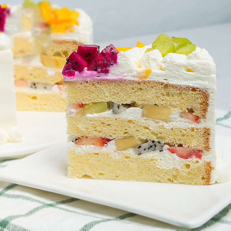 蛋糕材料: 圆形鲜奶蛋糕,水果夹层,表层时令水果装饰。