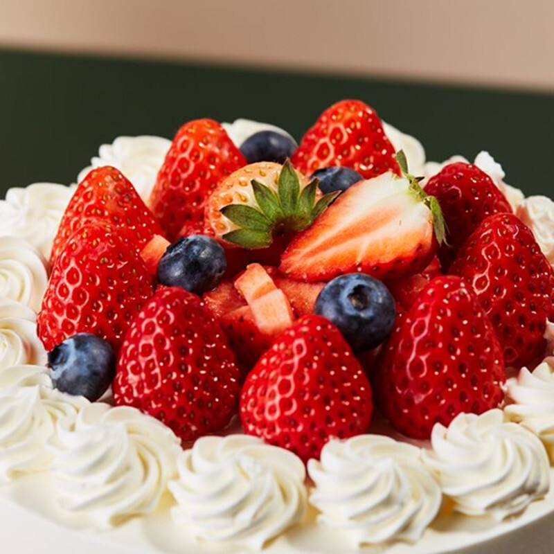 蛋糕材料: 圆形奶油草莓蛋糕,蓝莓、薄荷叶装饰。