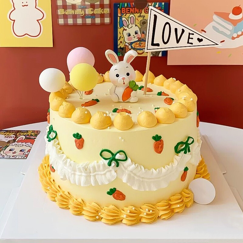 蛋糕材料: 圆形单层蛋糕,兔子胡萝卜元素,正面和侧面裱花。