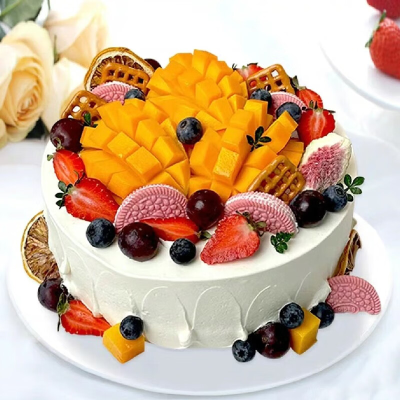 蛋糕材料: 圆形鲜奶蛋糕,时令水果铺面,柠檬片,饼干装饰。