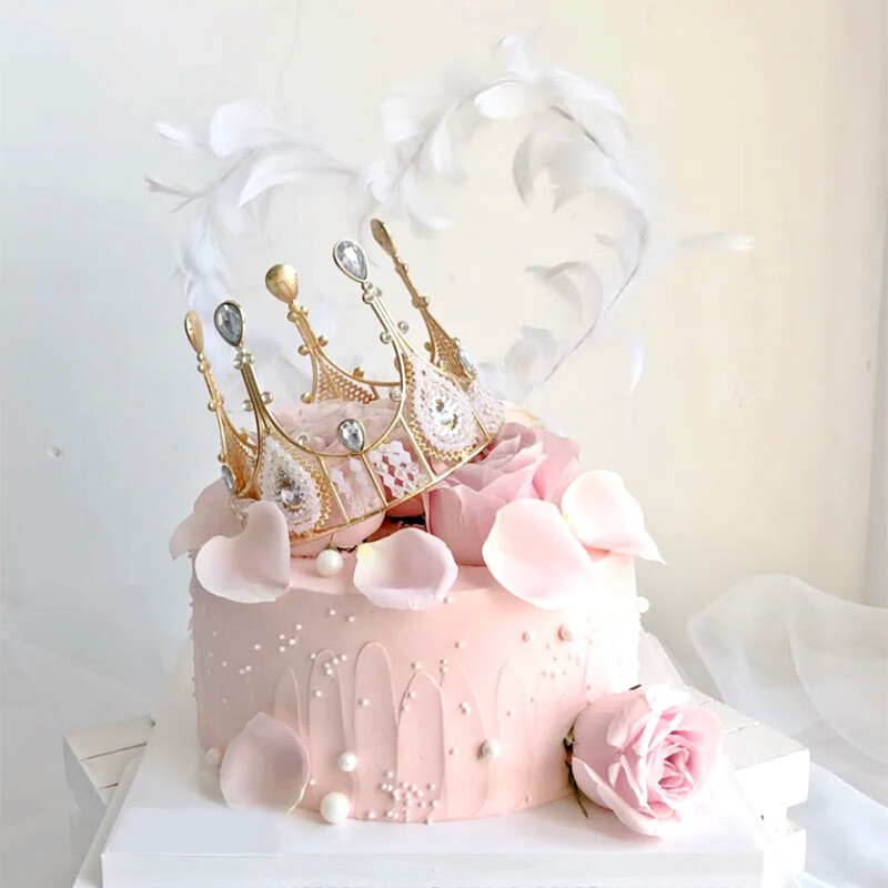 蛋糕材料: 奶油蛋糕,搭配粉玫瑰,玫瑰花瓣,皇冠,羽毛等装饰。
