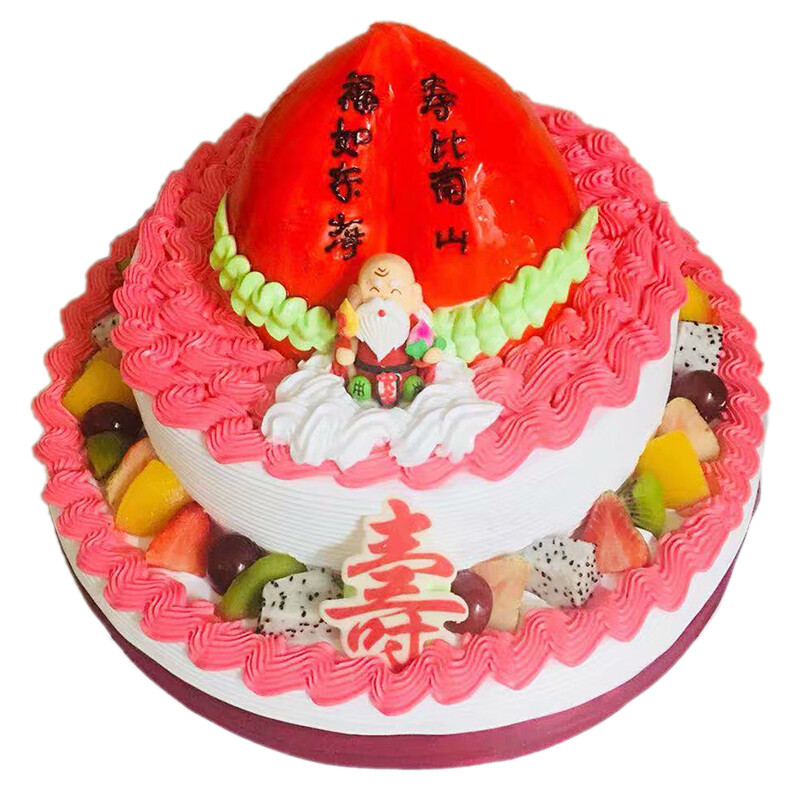 蛋糕材料: 2层蛋糕胚打底,水果铺面,奶油裱花,最上层寿桃造型。搭配寿星等祝寿插件。