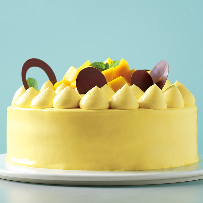 蛋糕材料: 圆形芒果鲜奶蛋糕。戚风蛋糕胚+芒果乳脂奶油(含新鲜芒果)叠层,表层芒果乳脂奶油+新鲜芒果+巧克力薄片装饰。(本款产品适宜食用温度为0-5摄氏度之间,请收到蛋糕后立即放入冰箱贮存)