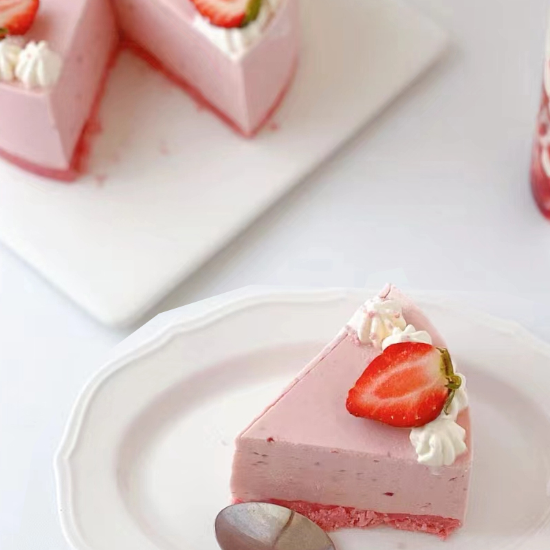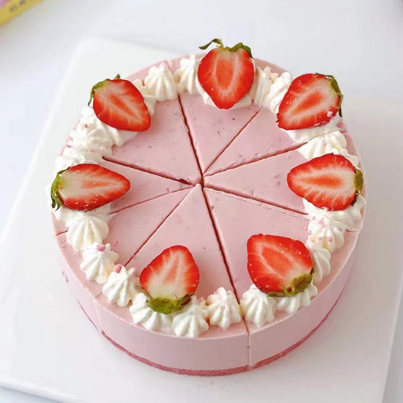蛋糕材料: 圆形草莓芝士蛋糕,草莓表面装饰,奶油裱花。
