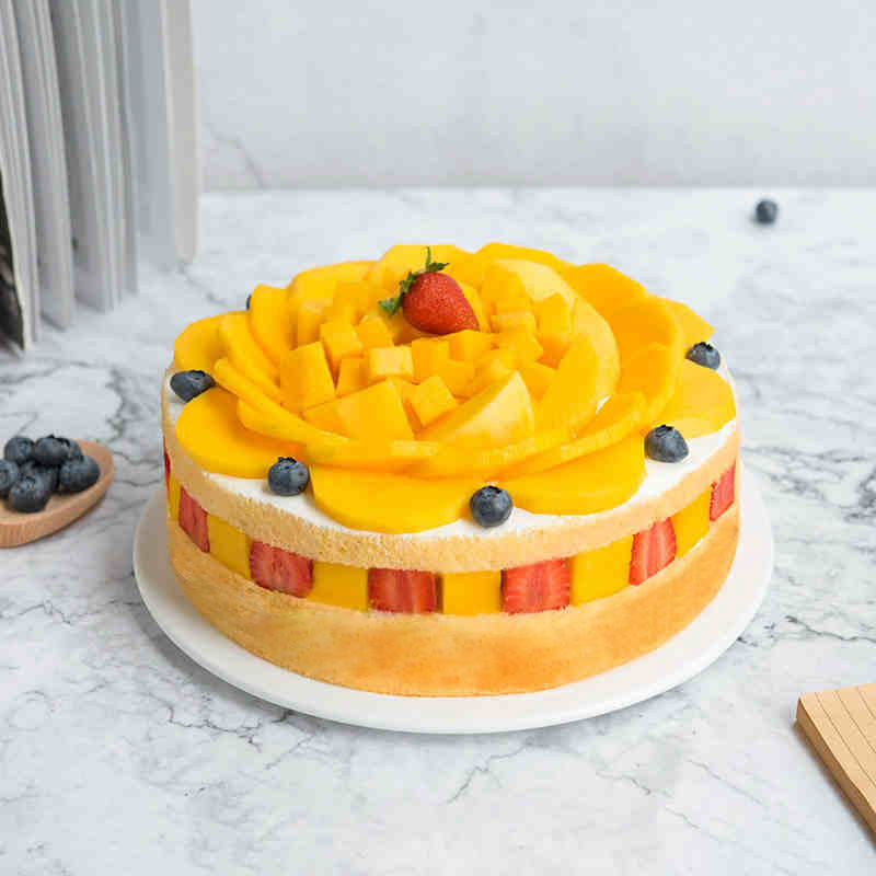 蛋糕材料: 芒果主题蛋糕,蛋糕正面,芒果层叠如花瓣状散开,草莓、蓝莓装饰,原味蛋糕胚,中间奶油夹层,奶油夹层用芒果及草莓围边。(此款蛋糕耗时较久,请提前预订或咨询客服)