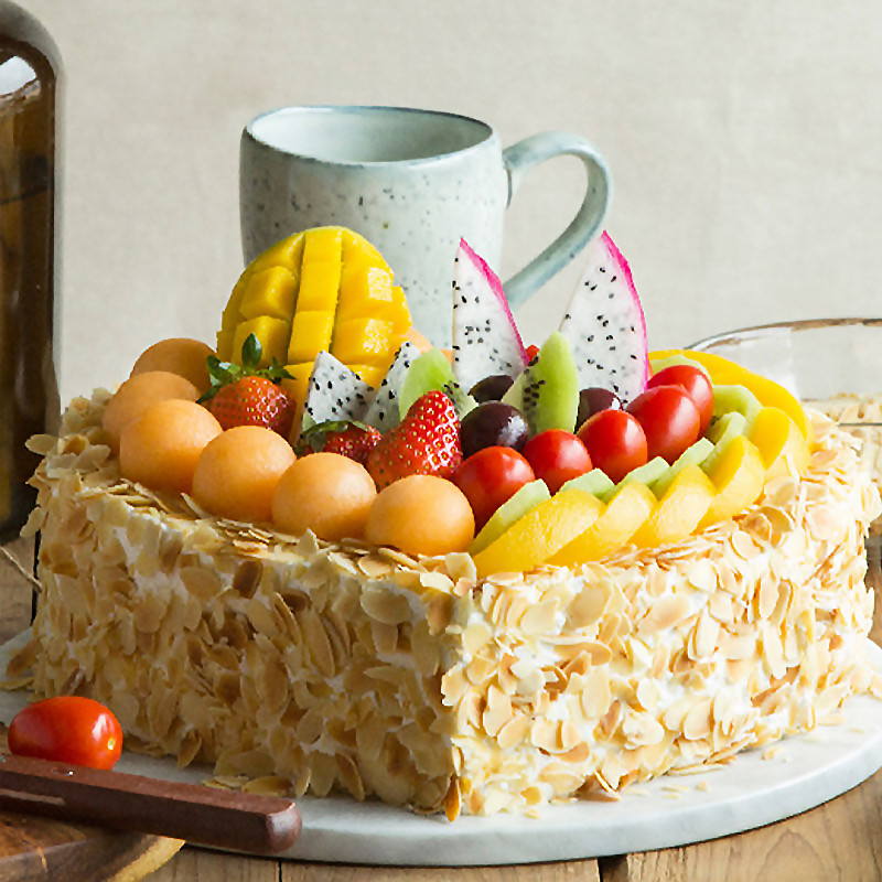蛋糕材料: 鲜奶水果心形蛋糕,上面一层时令水果,花生脆包围搭配。