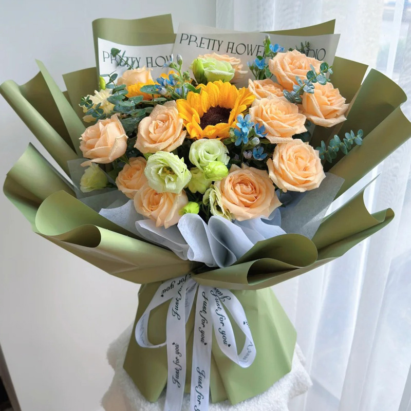 【阳光书签】精选3支向日葵,1支蓝色绣球,11朵香槟玫瑰,搭配2支多头橙色小玫瑰,尤加利叶,桔梗装饰。