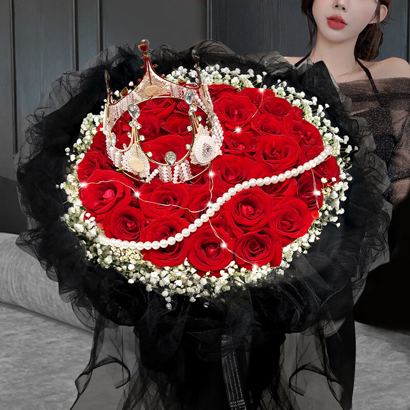 【世纪之恋】33支精品红玫瑰,1条珠串,1顶皇冠(款式随机),1条灯带,搭配满天星环绕装饰。