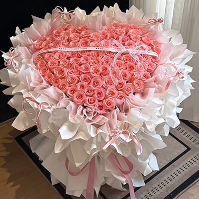 【只若初见】99朵戴安娜粉玫瑰,心形造型,搭配1条白色英文缎带装饰花面。