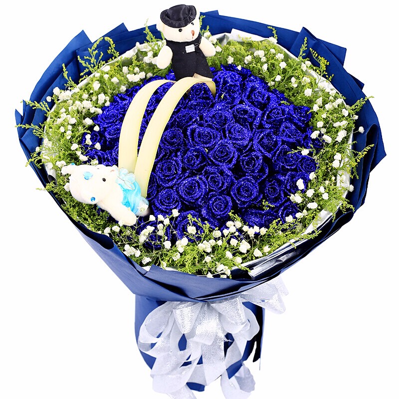 【萧瑟轻音】66朵顶级蓝玫瑰,2只可爱小熊,满天星、黄莺环绕。