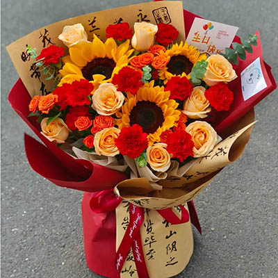 【心向暖阳】3枝精品向日葵,19朵红色康乃馨和香槟玫瑰混搭(红色康乃馨10枝,香槟玫瑰9枝),3枝多头橙色泡泡,搭配尤加利叶装饰。