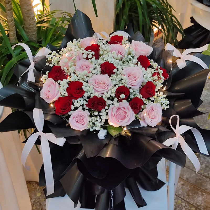 【点滴幸福】红玫瑰、粉玫瑰共24朵,1条灯带,满天星、栀子叶丰满间插。