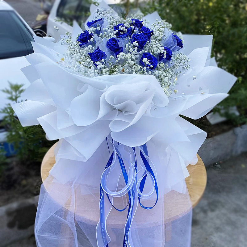 【华尔兹之恋】11朵蓝色妖姬,搭配雪梨纸间隔装饰,白色满天星间插。