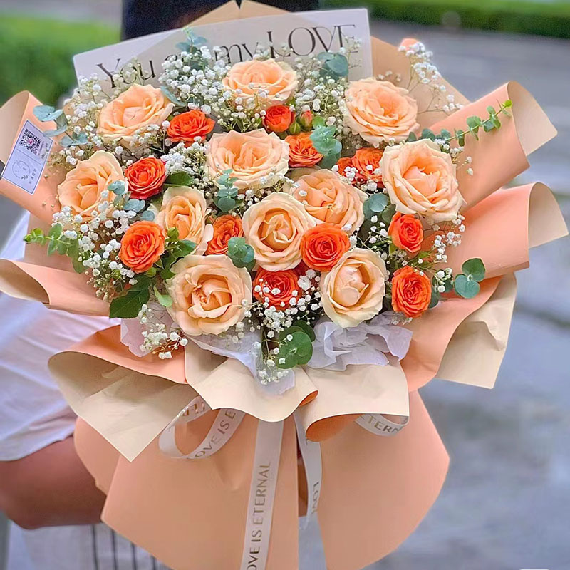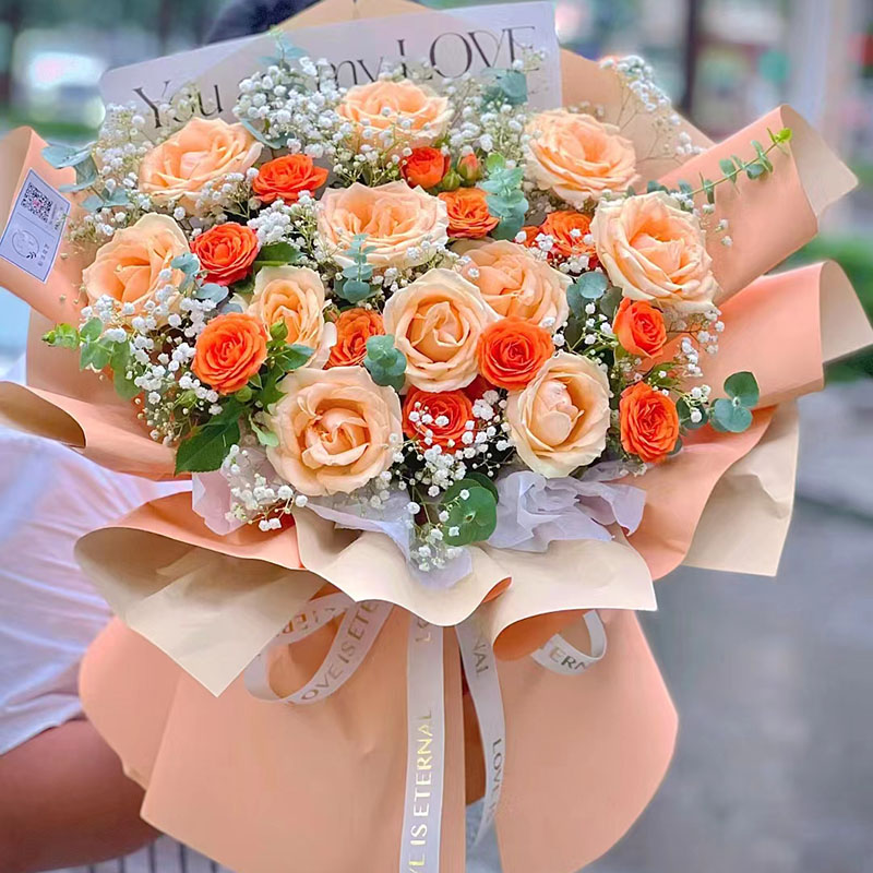 花 材:11支精品香槟玫瑰,搭配6支橙色多头小玫瑰,满天星,尤加利叶装饰。