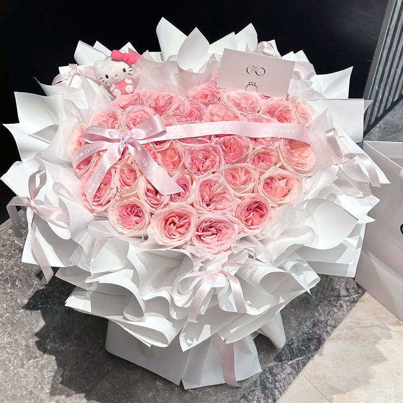 花 材:精选33朵粉荔枝玫瑰,心形造型,1只kitty猫(款式随机),表面粉色丝带蝴蝶结装饰。
