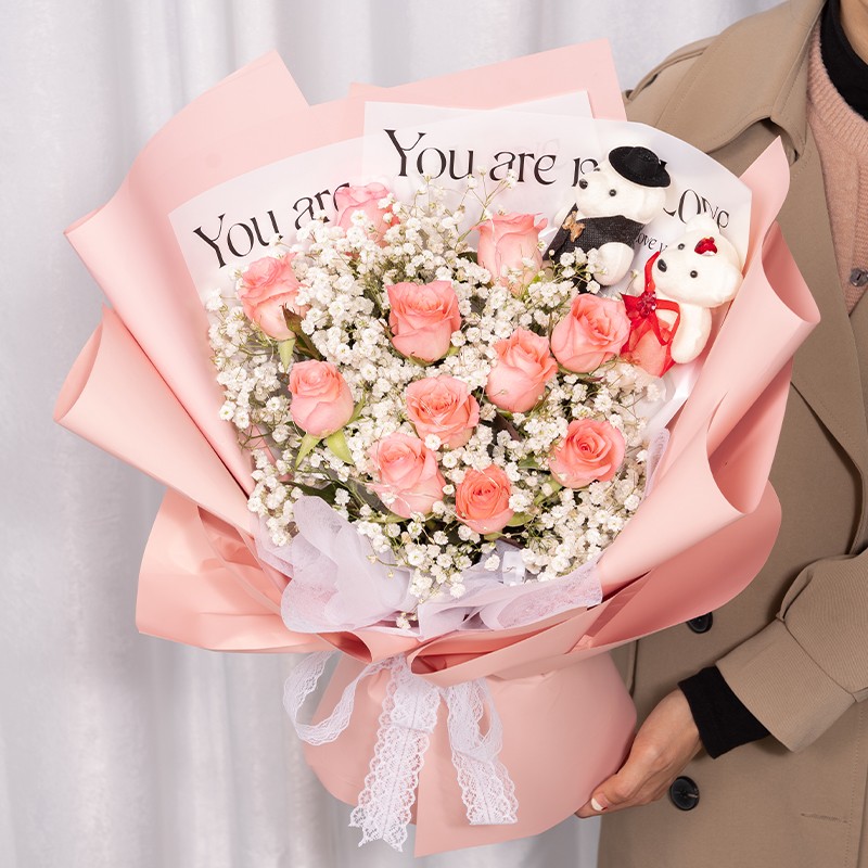 花 材:11枝戴安娜粉玫瑰,1对小熊,1条灯串,搭配白色满天星、尤加利叶丰满间插。