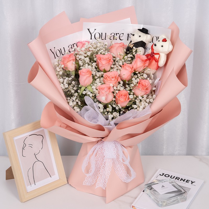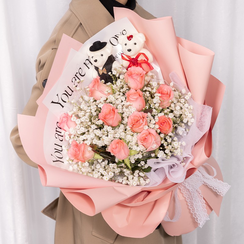花材: 11枝戴安娜粉玫瑰,1对小熊,1条灯串,搭配白色满天星、尤加利叶丰满间插。