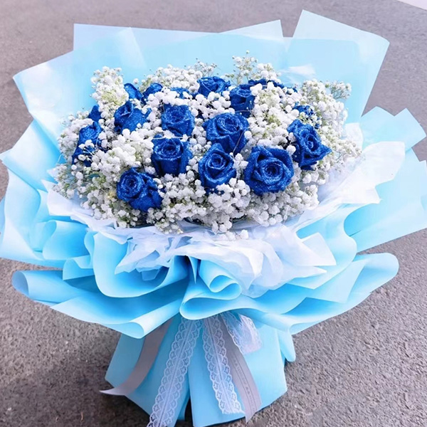 花 材:精选19朵蓝色妖姬,1条彩灯,白色满天星丰满间插。
