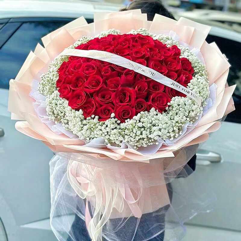 花 材:精选52朵红玫瑰,白色满天星外围环绕,白色英文缎带装饰花面。