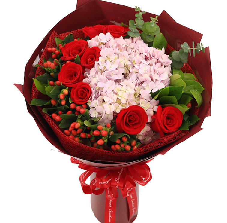 花材: 9朵红玫瑰,2只绣球花,搭配红豆、尤加利叶、栀子叶。
