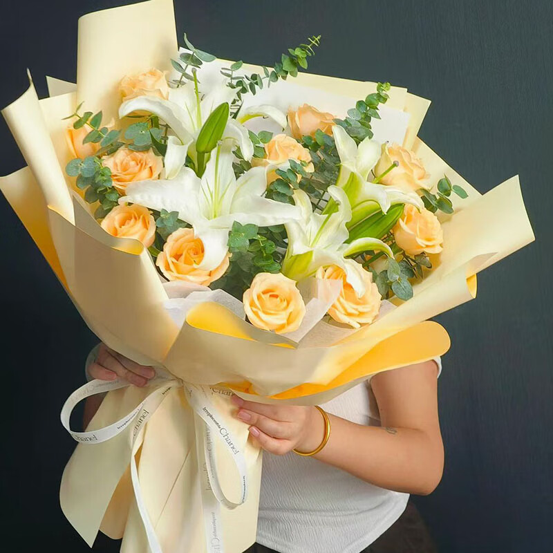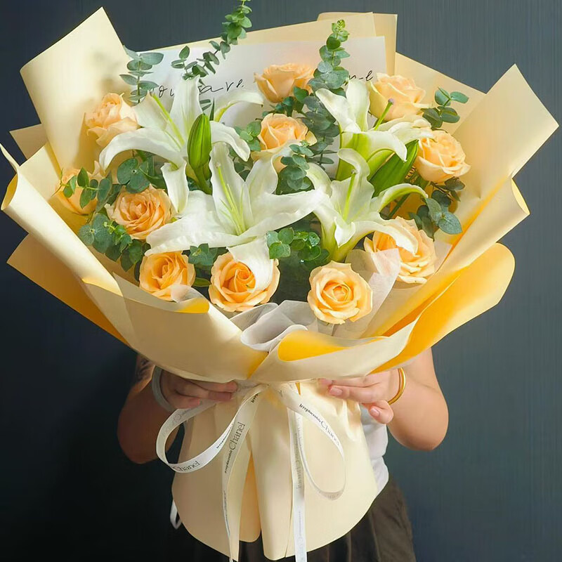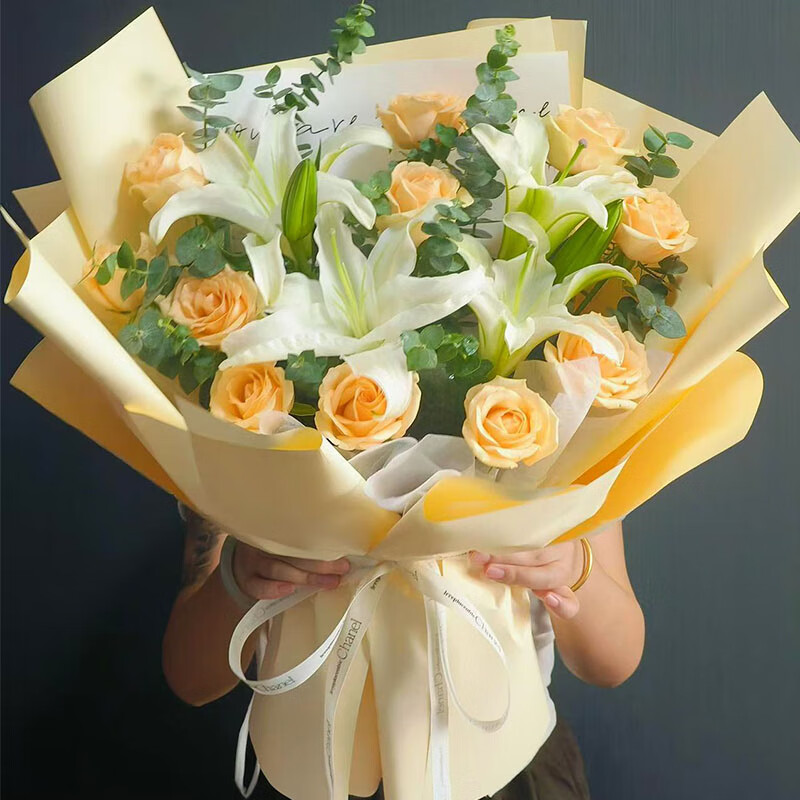 花材: 11朵香槟玫瑰,2支白色多头香水百合,尤加利叶装饰。