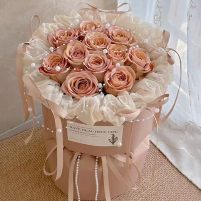 花材: 精选11枝卡布奇诺玫瑰,珠串装饰花面花体,5支同色系蝴蝶结围绕包装装饰,白色纸内衬,同色系小香风包装,珠串和同色系缎带花结。
