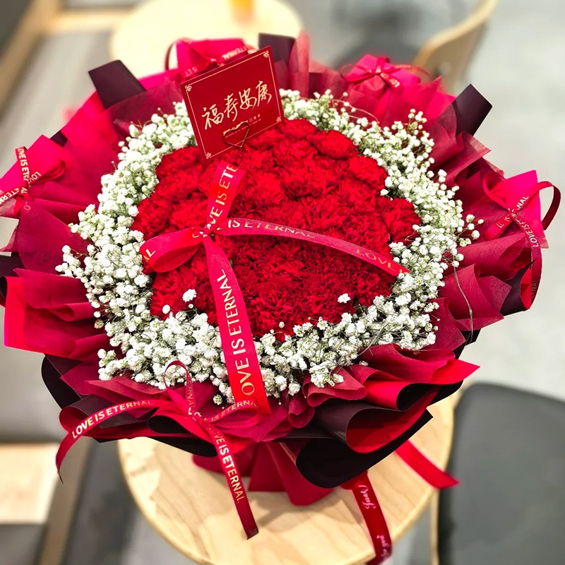 花材: 33枝精品红色康乃馨,白色满天星围边丰满环绕,红色蝴蝶结装饰花面。