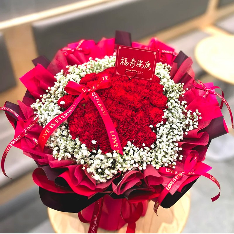 花 材:33枝精品红色康乃馨,白色满天星围边丰满环绕,红色蝴蝶结装饰花面。