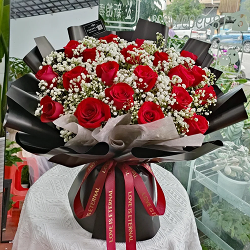 花 材:33朵红玫瑰,4支多头粉色香水百合,搭配尤加利叶、满天星装饰。