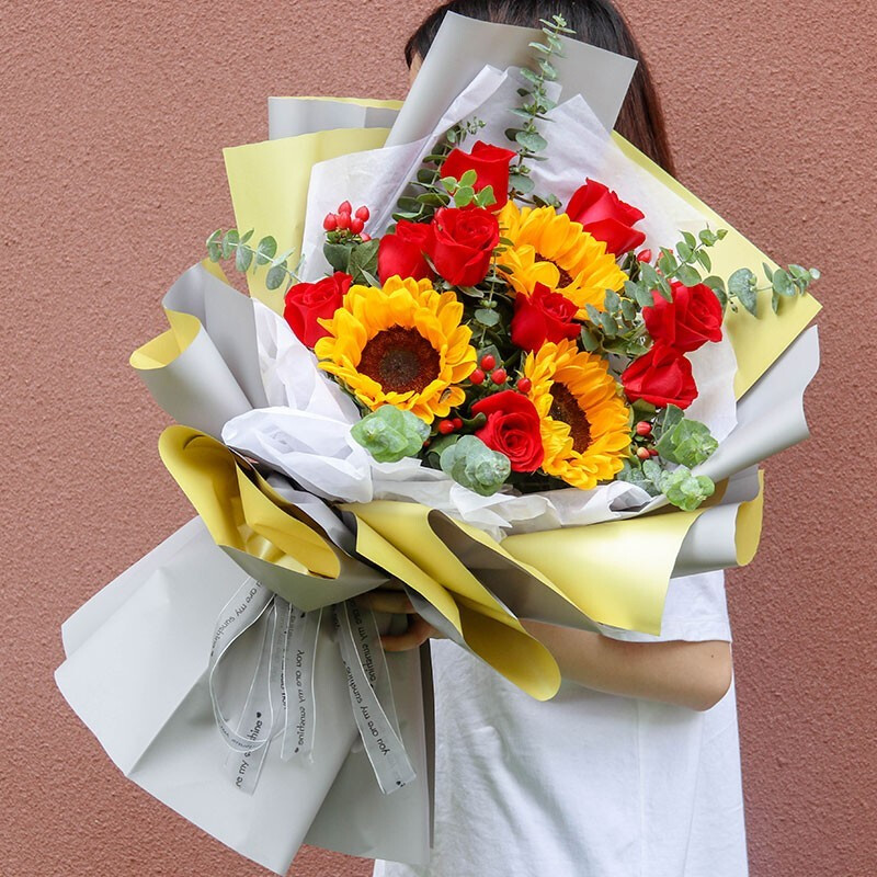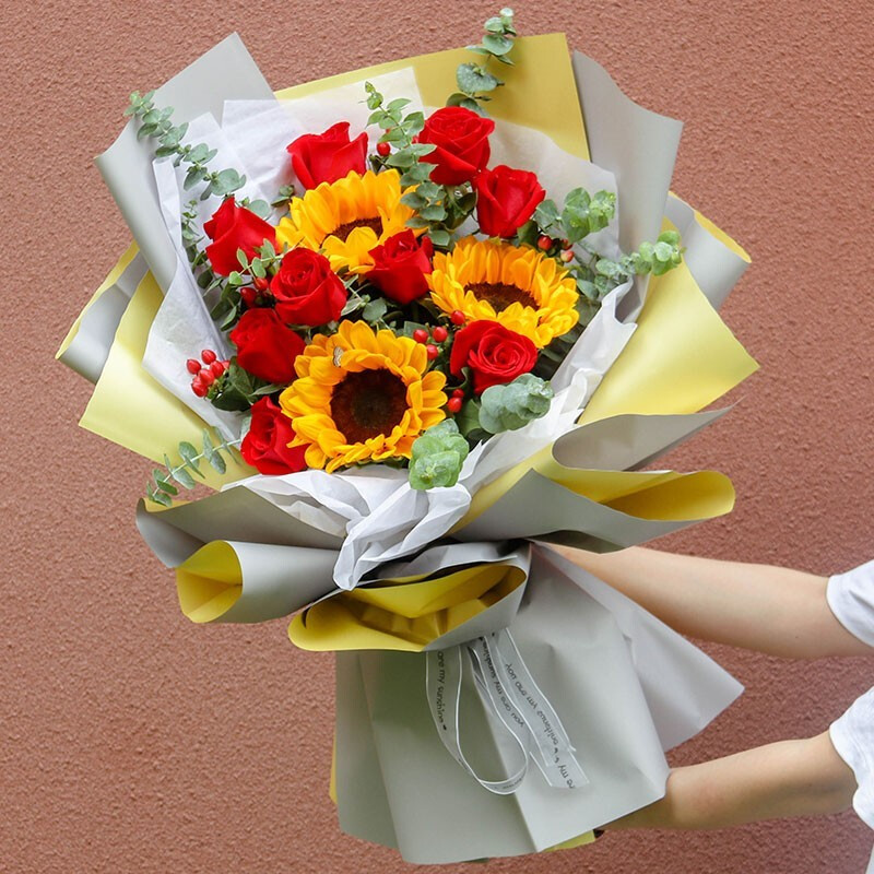 花材: 3支向日葵,9朵红玫瑰,搭配红豆、尤加利叶装饰。