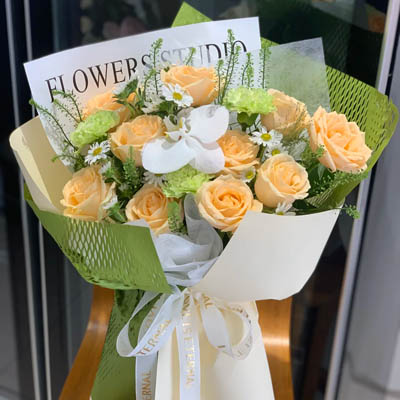花材: 10枝香槟玫瑰,1朵白色蝴蝶兰,3支绿色康乃馨,搭配绿铃草,白色小雏菊丰满间插