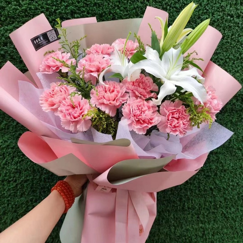 花 材:11支精品粉康乃馨、1支多头白百合,搭配黄莺装饰。