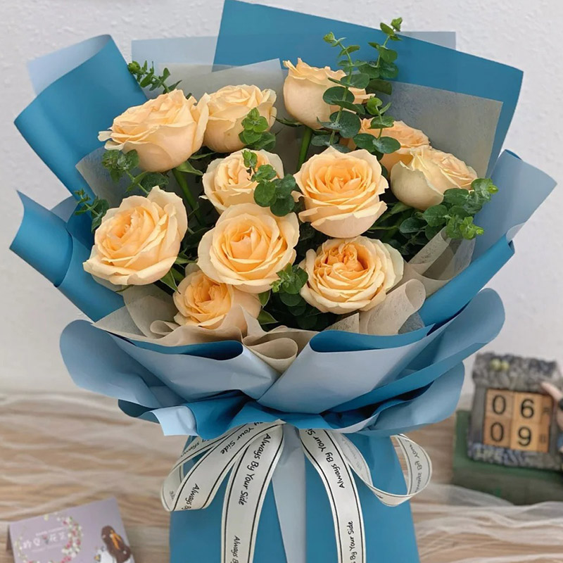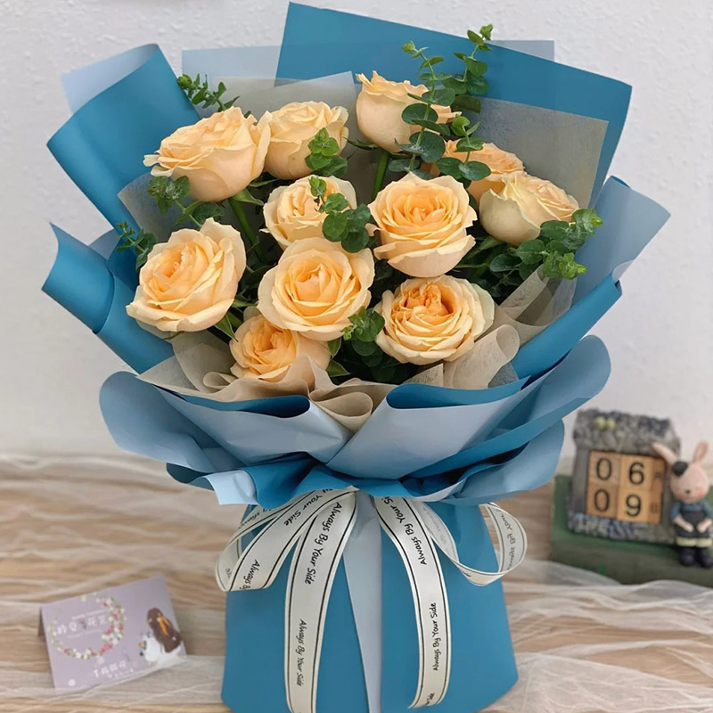 花材: 11朵香槟玫瑰,尤加利叶间插配饰。