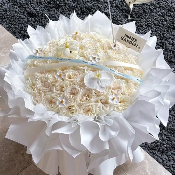 花 材:52支白荔枝玫瑰,1朵白色蝴蝶兰,1支白色郁金香,7支干花紫罗兰,2个气球,1条丝带装饰花面。白色纸多层包装。