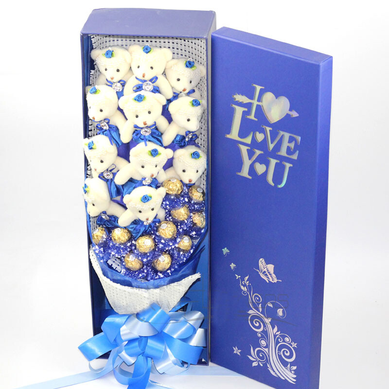 花 材:11只可爱小熊,11颗顶级费列罗,蓝色包装。