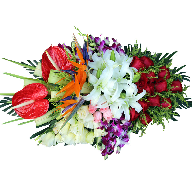 包装: 2支多头白百合、4支粉玫瑰、13支红玫瑰、2支红掌、4支白色洋桔梗、2支天堂鸟,搭配适量黄莺草、散尾葵、剑叶、洋兰。
