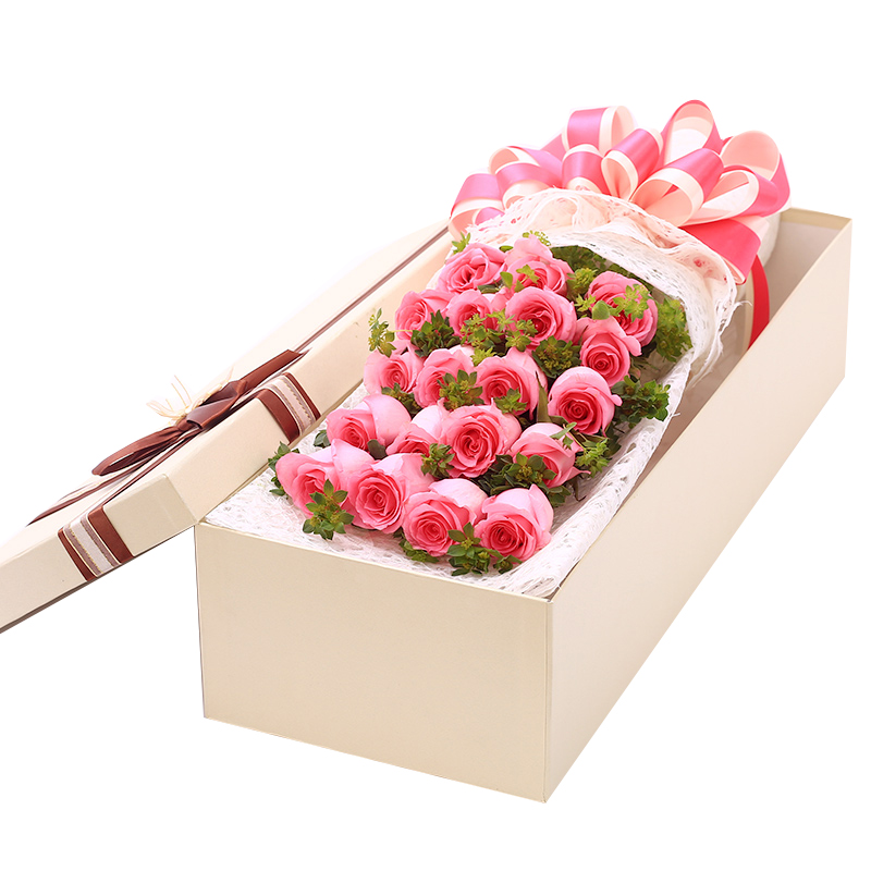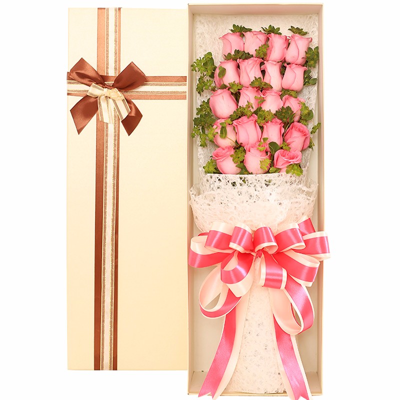 花材: 19支粉玫瑰,搭配适量叶上黄金间插。
