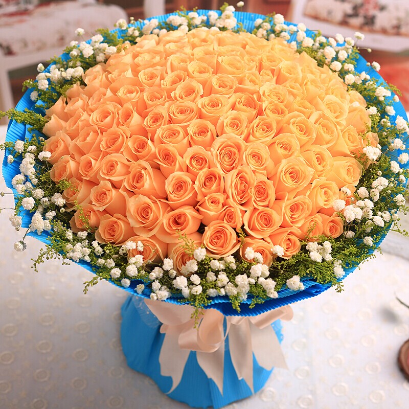 花 材:精选99朵香槟玫瑰,满天星外围点缀。