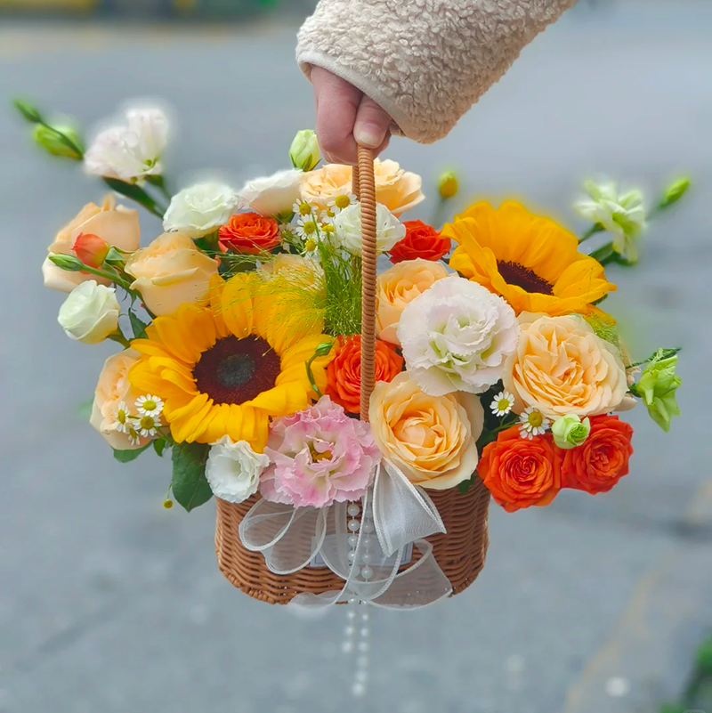 花材: 精选8枝香槟玫瑰,2枝向日葵,1朵粉色康乃馨,3支多头橙色泡泡,4支浅色多头洋桔梗,搭配洋甘菊、喷泉草、尤加利叶装饰。