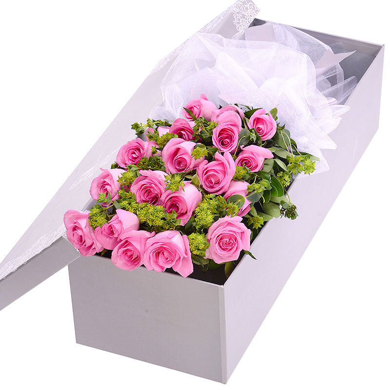 花材: 19枝精品粉玫瑰,搭配叶上金、绿叶。