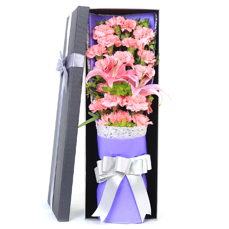 花材: 精选19朵粉色康乃馨,1支多头粉百合,搭配叶上黄金、丝带草装饰。